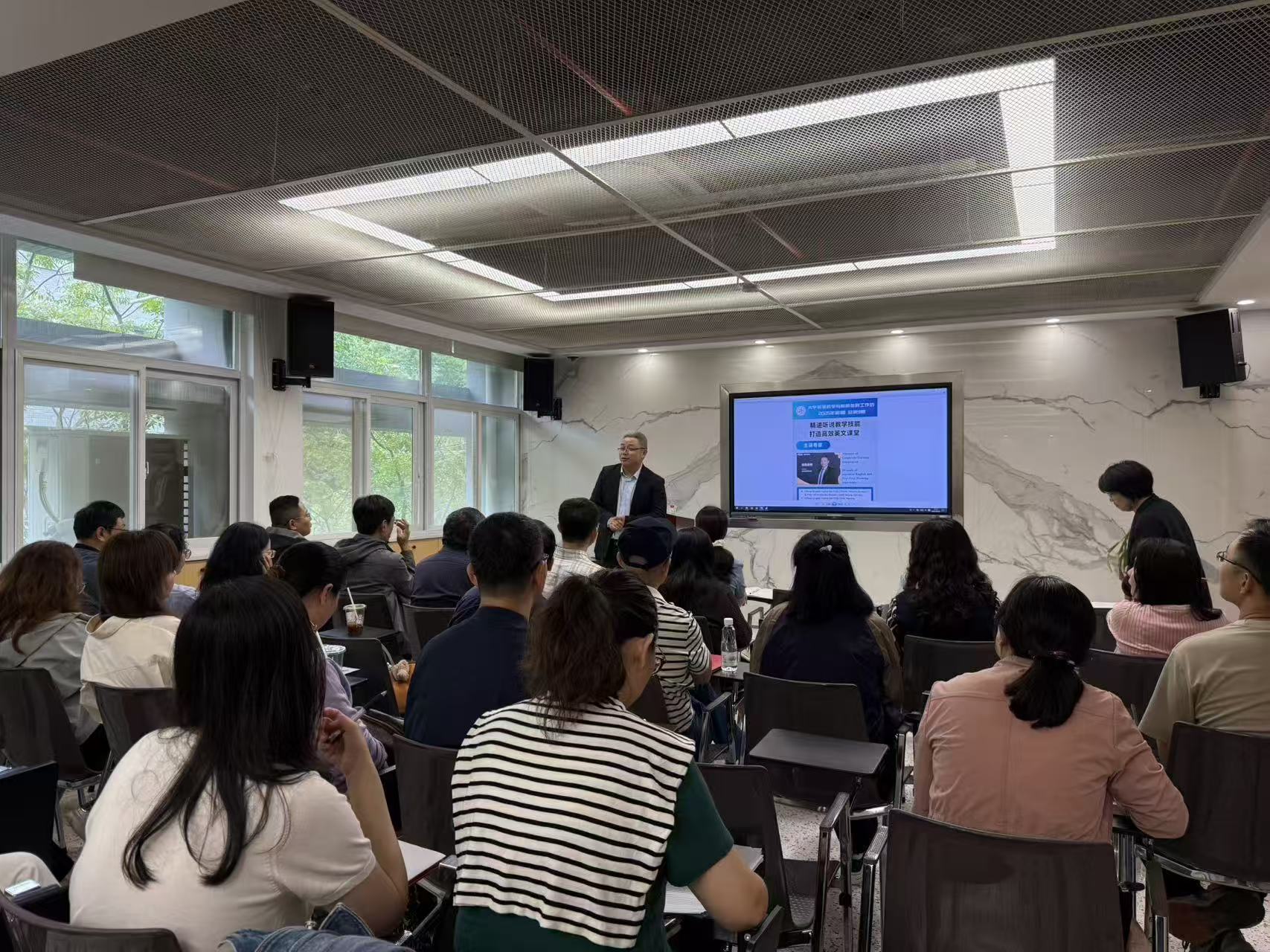 方栋老师结合自身教学实践,从语言、心理、文化等多角度分析了听说课堂学生面临的主要困难,鼓励教师从语言流利度、语音准确度、意义清晰度等方面对学生加以引导和帮助,并以托福口语考试试题为例,生动展示了话题展开、论证和阐述观点的有效路径。讲座风格幽默,在教学交流的同时也打造了一堂听说教学的精彩示范课。教师们纷纷参与互动训练,在讲座结束后就关心的问题向方老师请教,通过讨论对教育教学有了更深入的认识。
